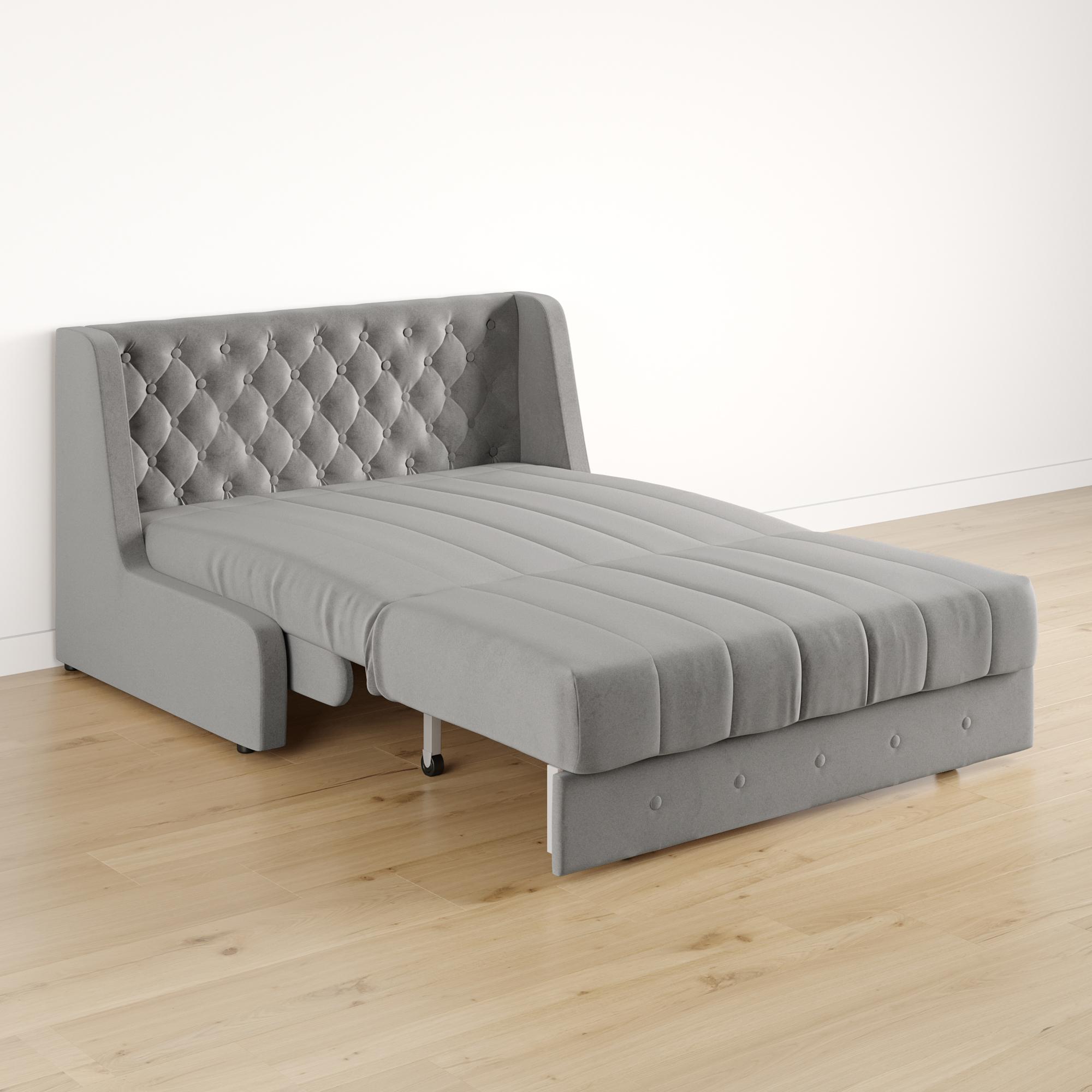 - Оригинальный дизайн. Изюминкой дивана является наличие дополнительной кроватной спинки, которая имеет эксклюзивный декор в виде каретной стяжки.