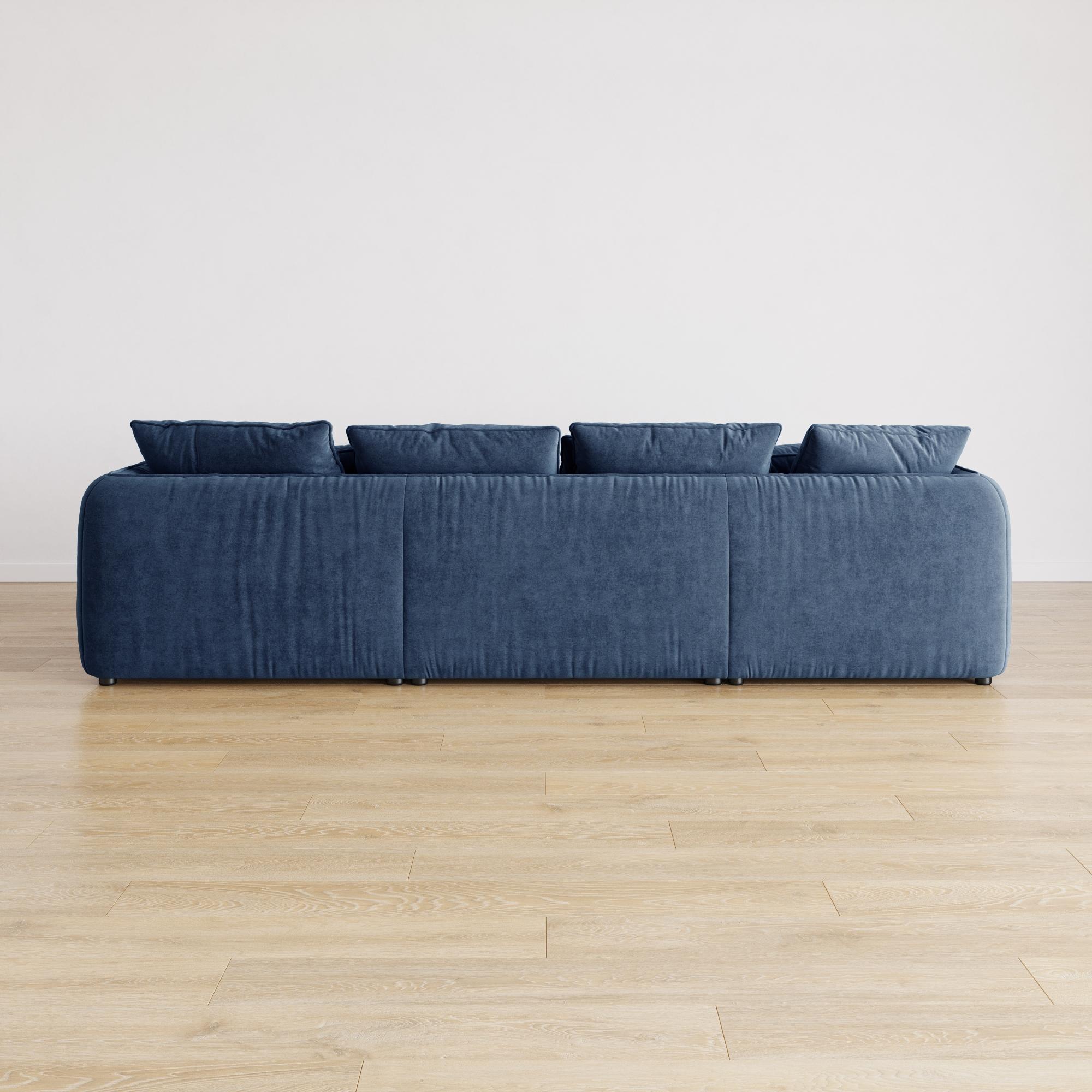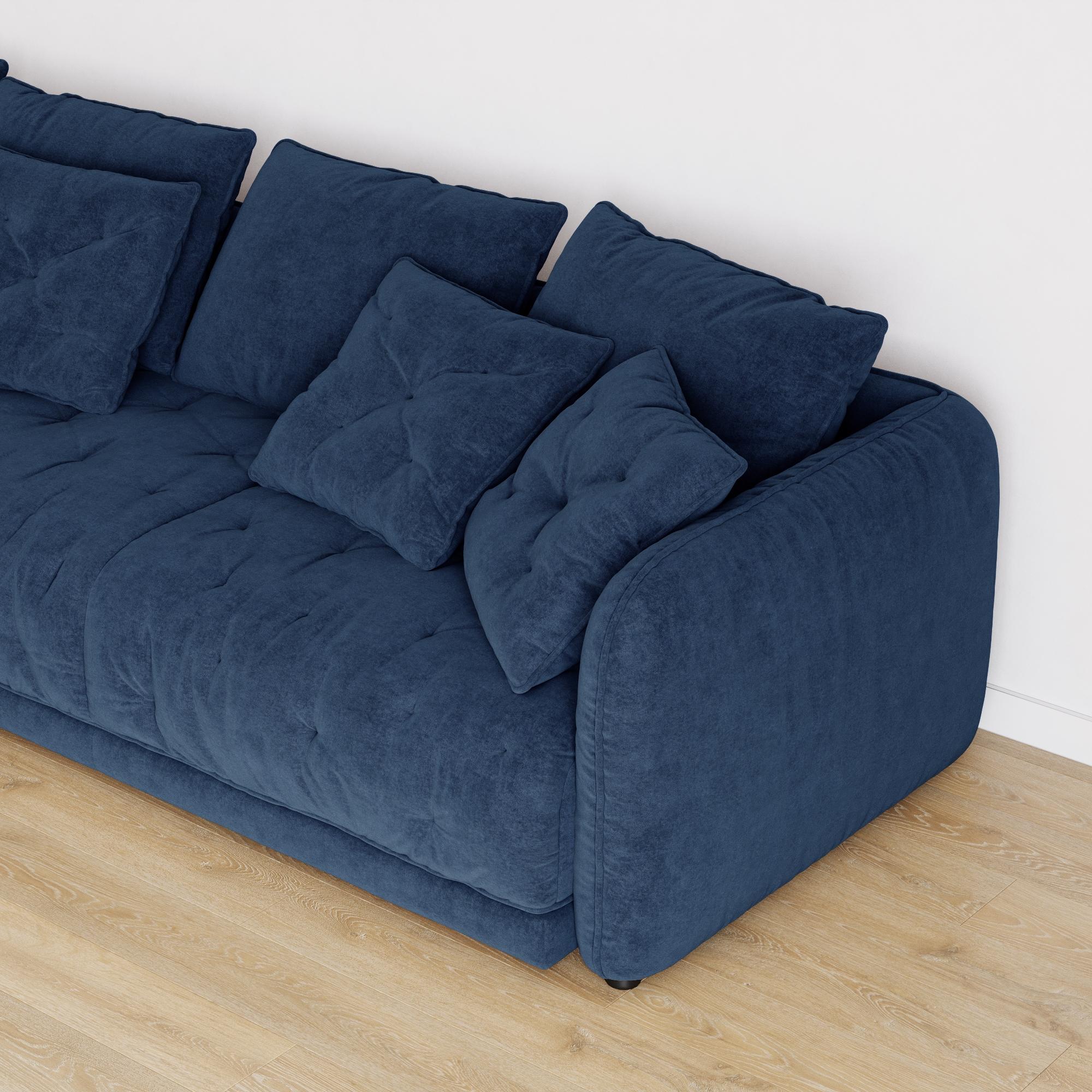 Обратная сторона спинки в обивочной ткани. Диван прекрасно подойдёт для зонирования помещений или расположения в центре комнаты.