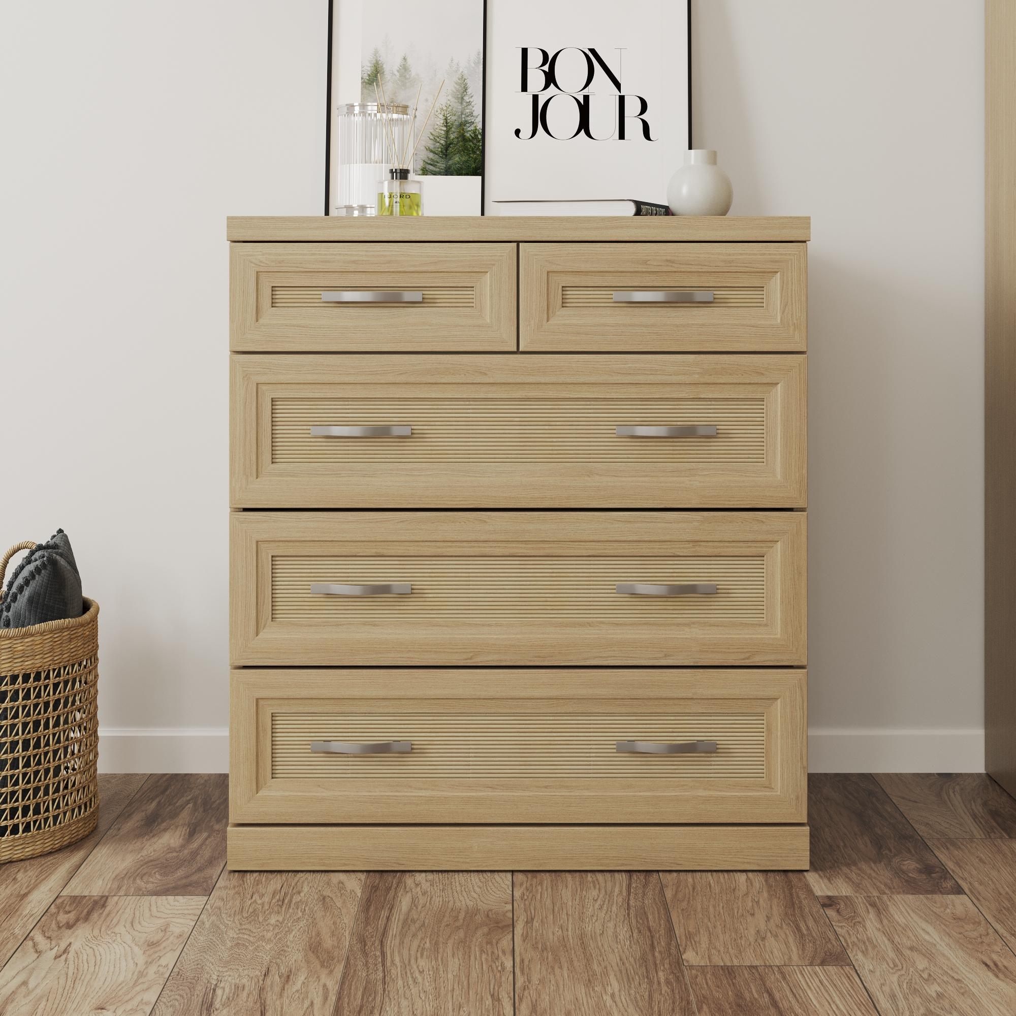 - Пять ящиков. Два верхних малых ящика удобны для хранения аксессуаров и мелочей. В трех нижних широких ящиках сложенная одежда и белье всегда будут в порядке и под рукой.