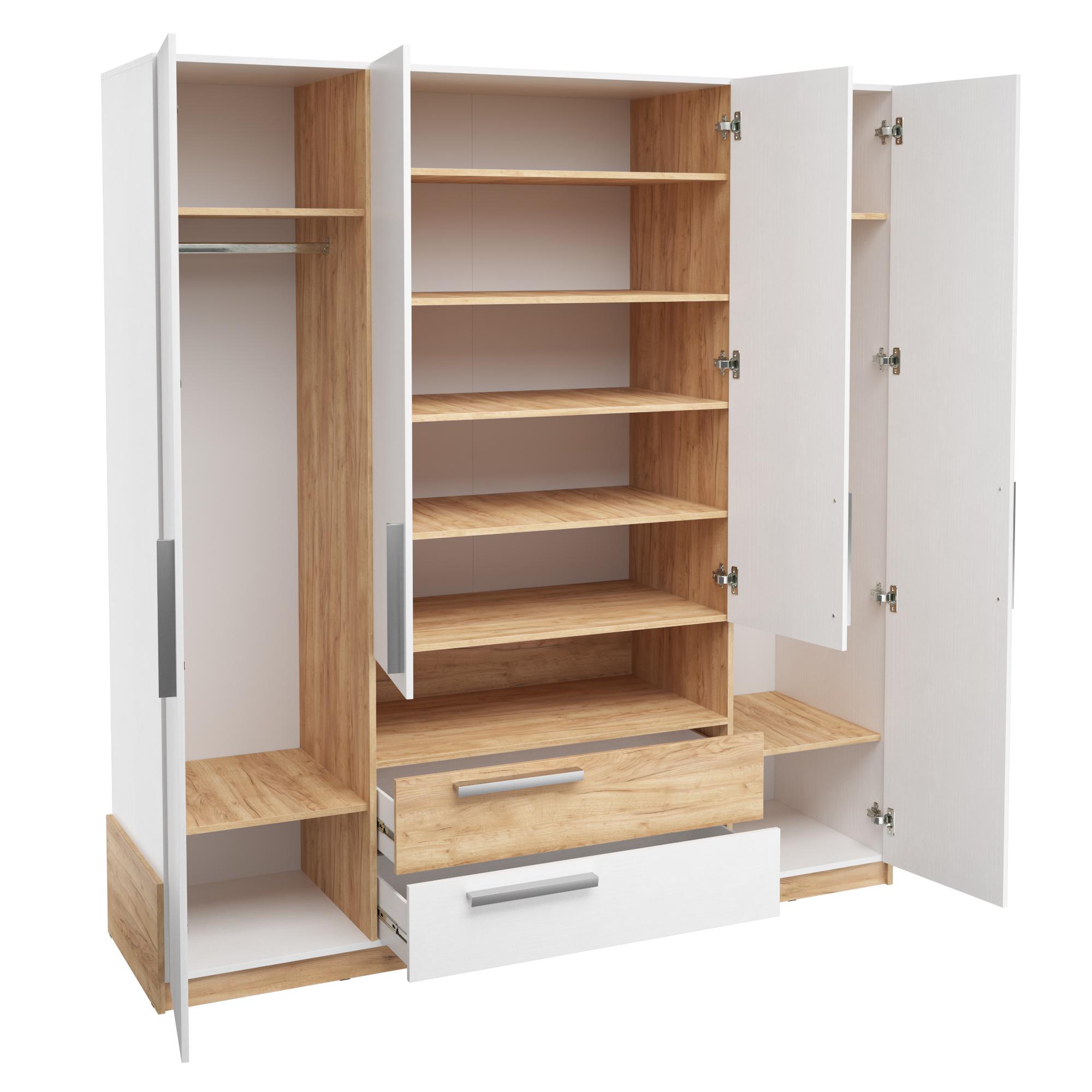 - Полноценный гардеробный модуль. Вместительный четырёхстворчатый шкаф благодаря своей конструкции поможет разместить множество вещей: на штанге займёт своё место одежда на вешалках, а на полках и в выдвижных ящиках можно хранить в порядке постельное белье, трикотаж или коробки с обувью.