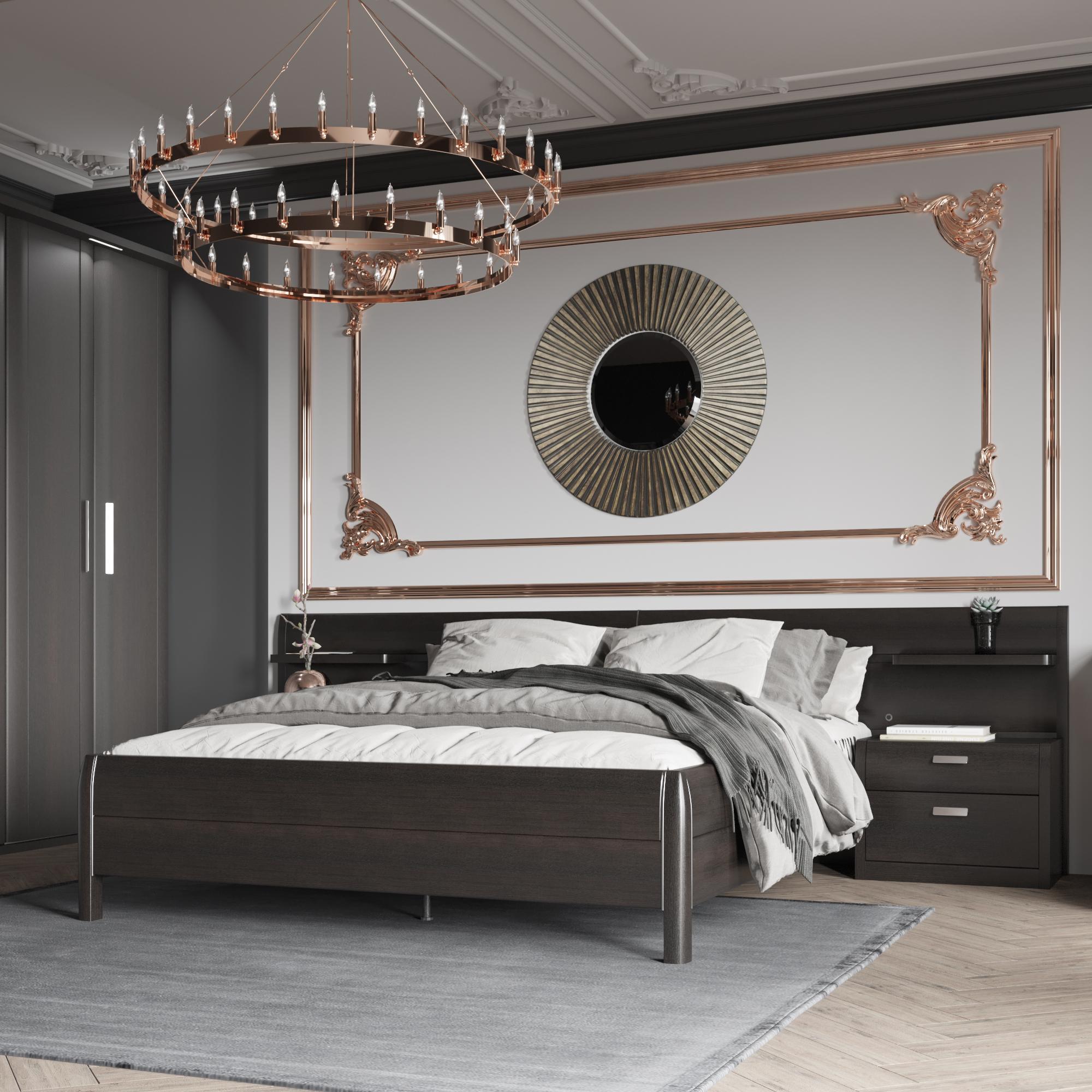 Экран спинки: ЛДСтП толщиной 28 мм с декоративным профилем из МДФ и ХДФ. Поставляется в собранном виде с установленной подсветкой и фурнитурой.