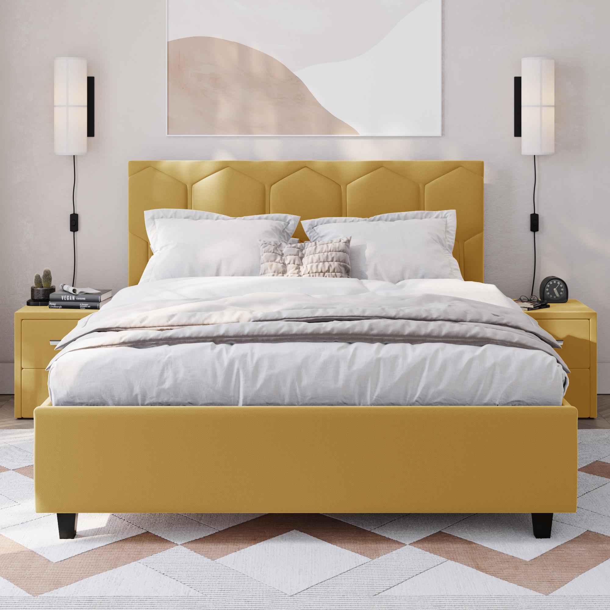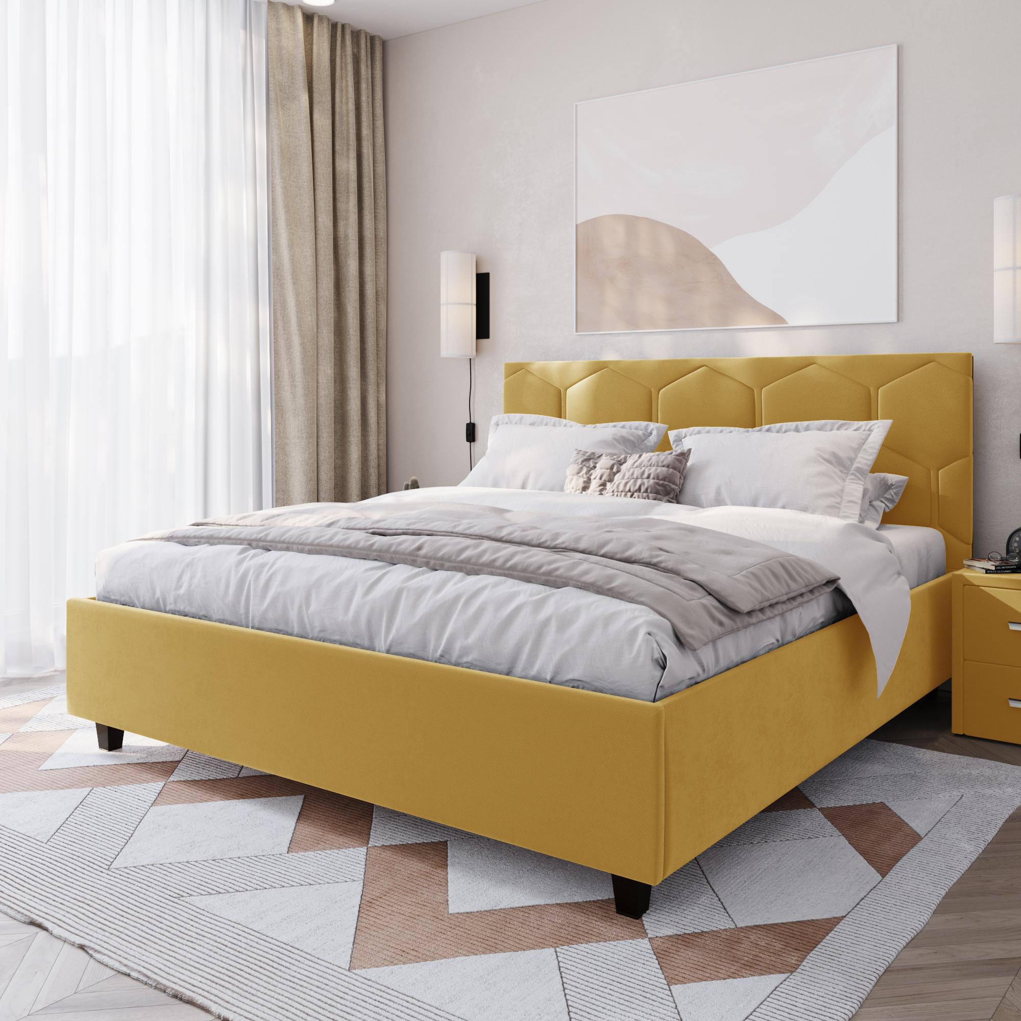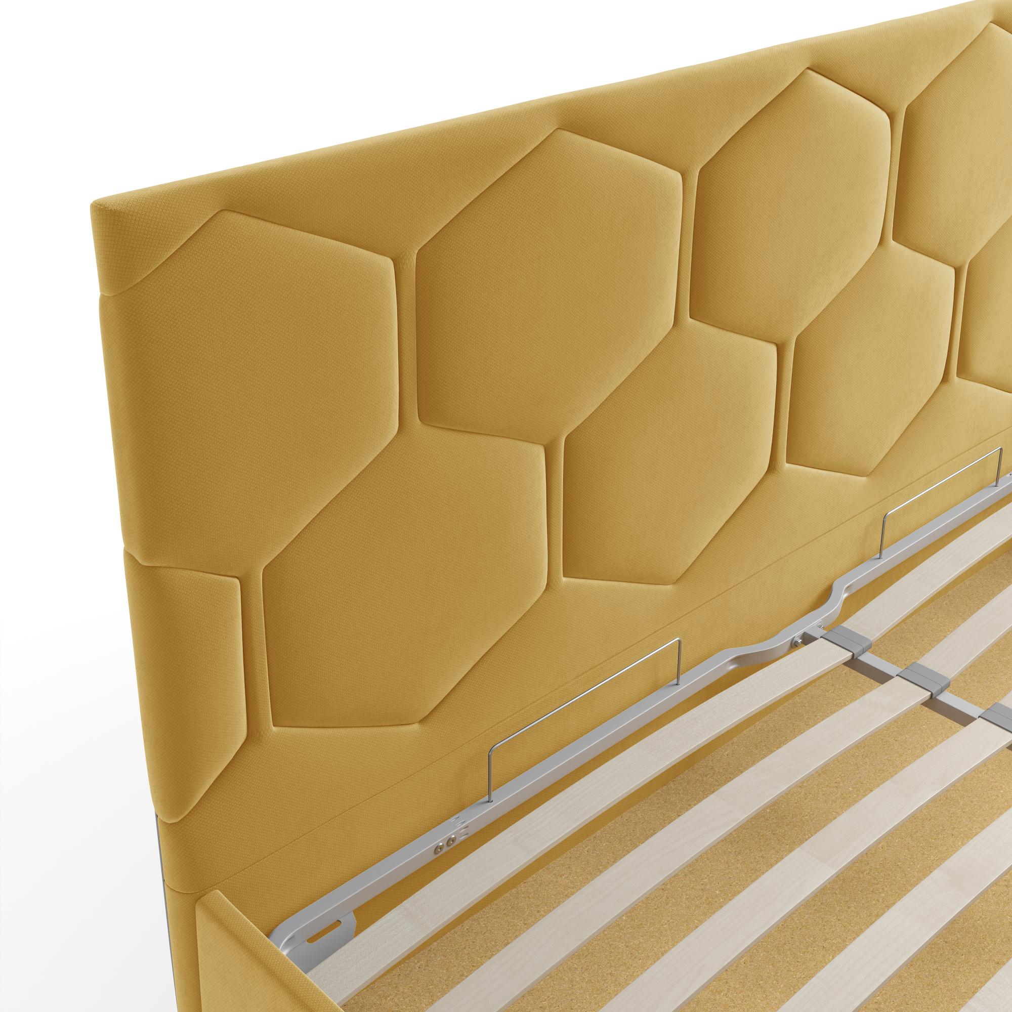 - Мягкое изголовье. Яркий геометрический декор добавляет изящества в дизайн кровати.
