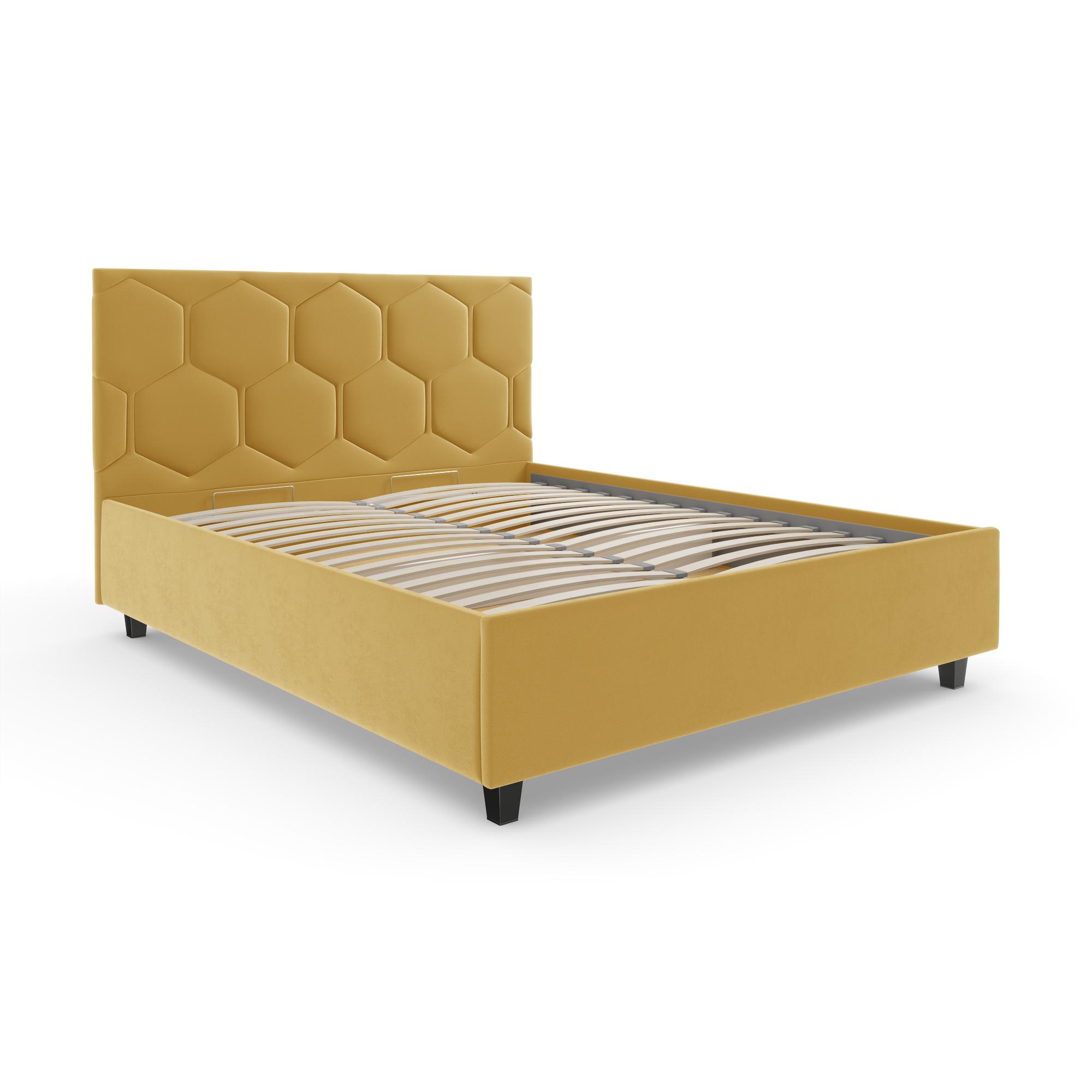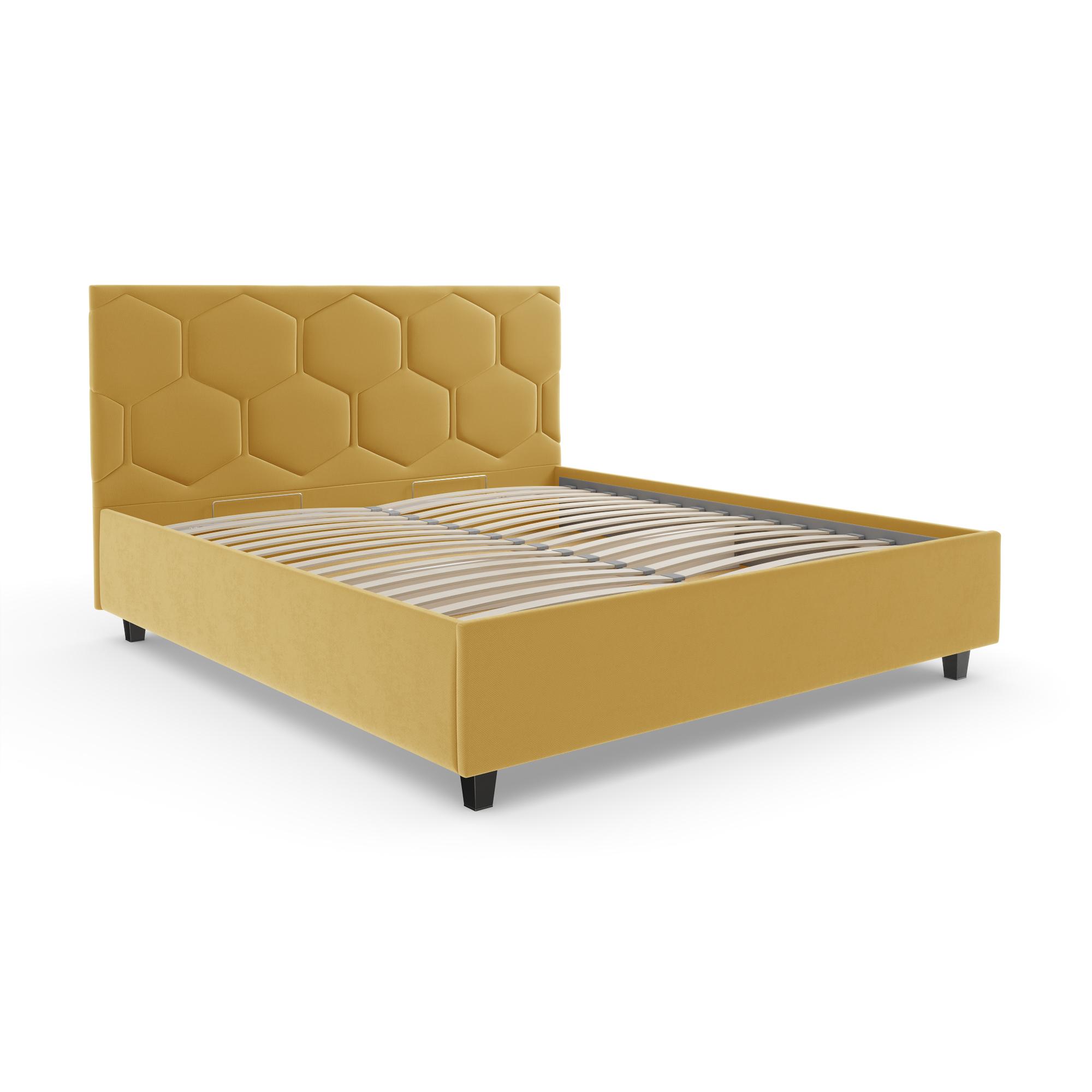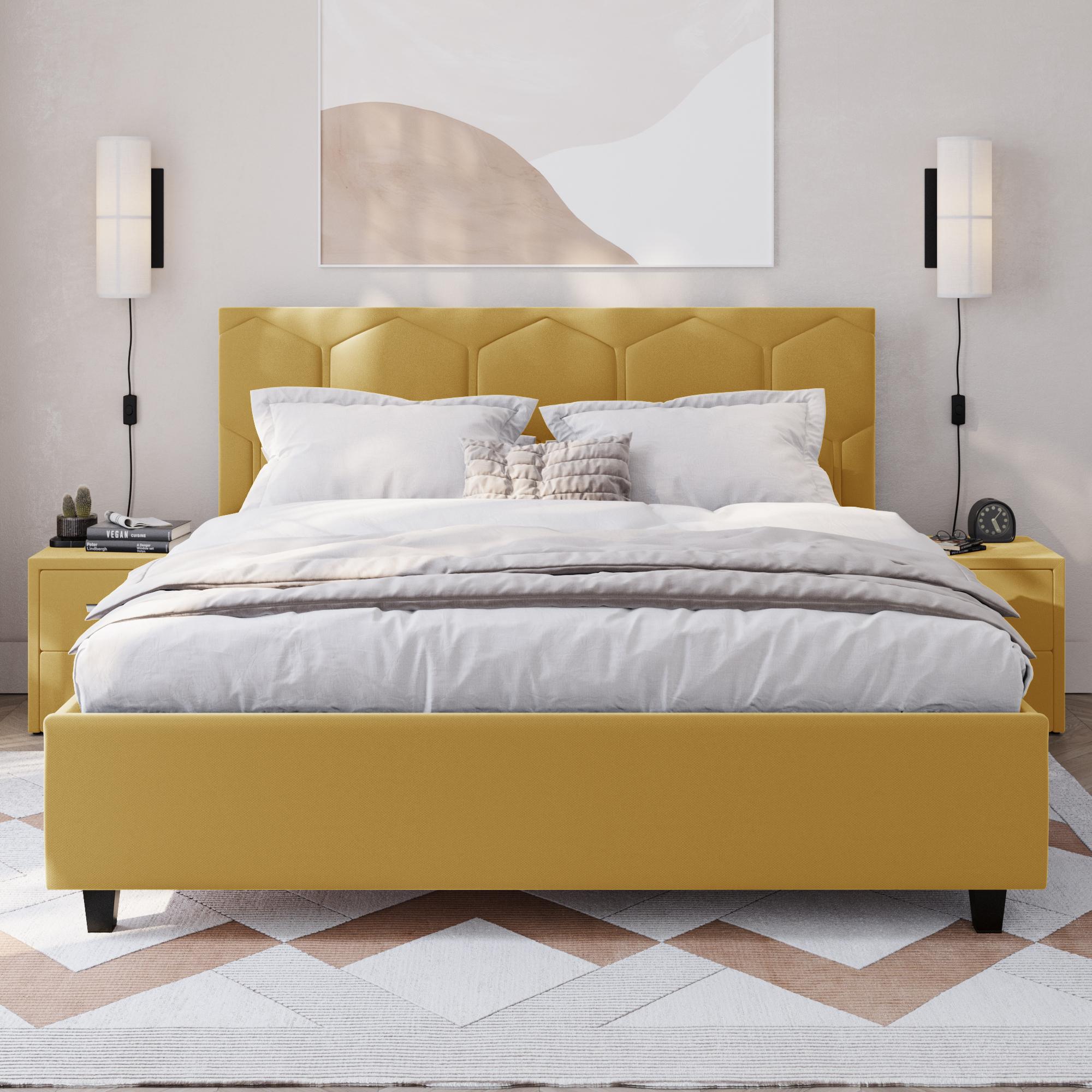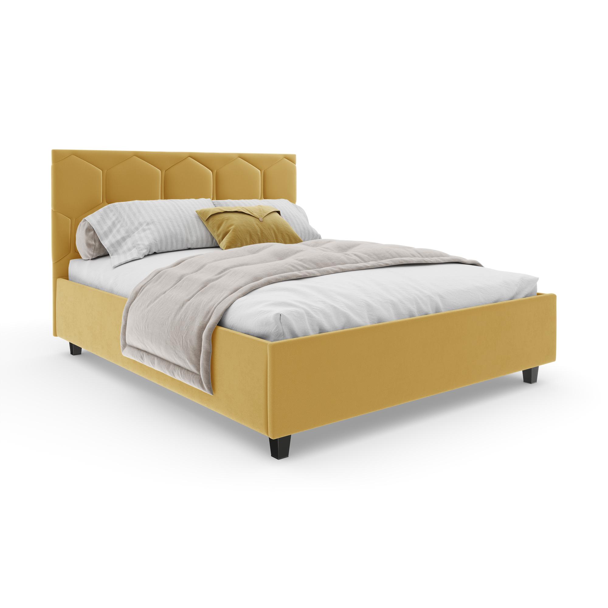 - Мягкое изголовье. Яркий геометрический декор добавляет изящества в дизайн кровати.