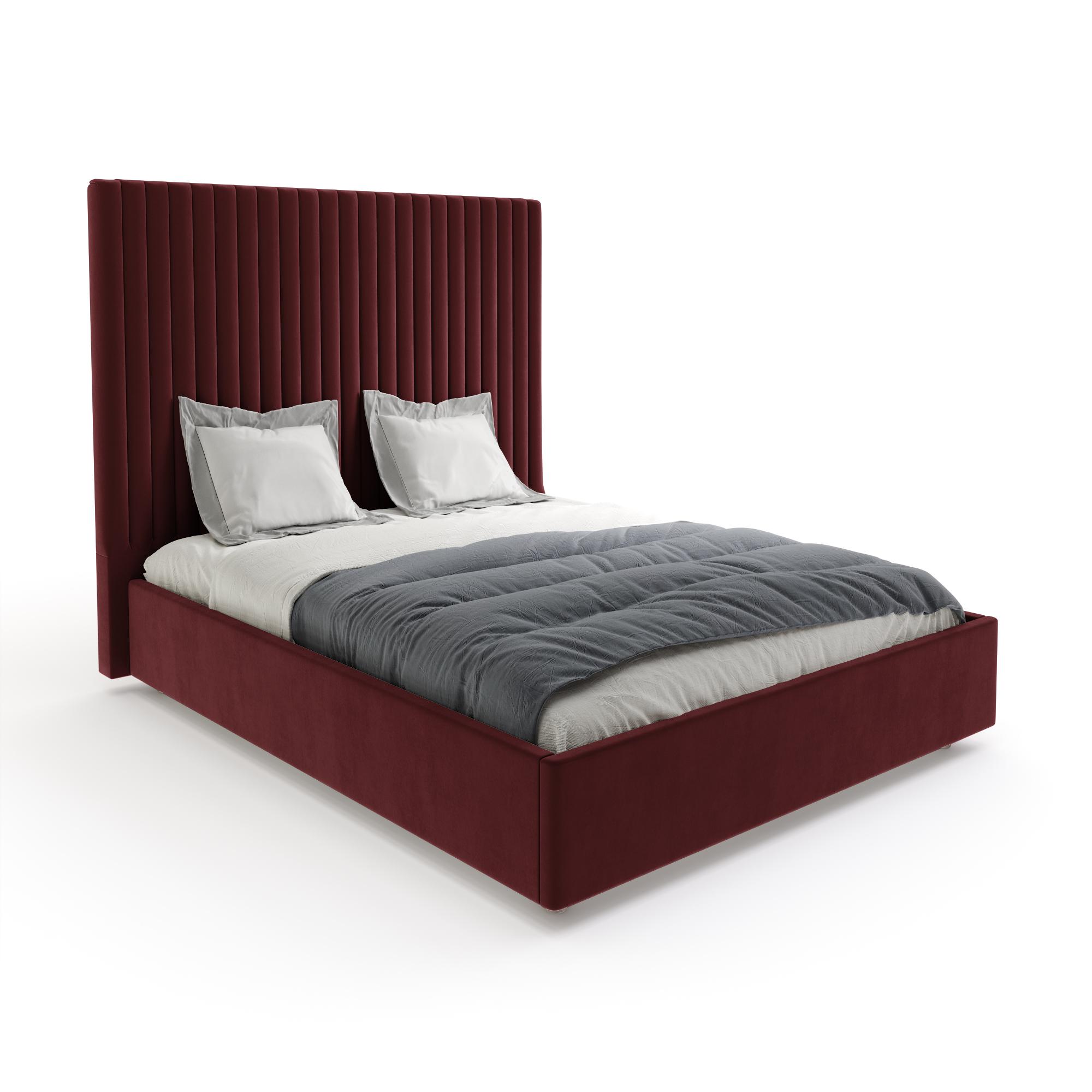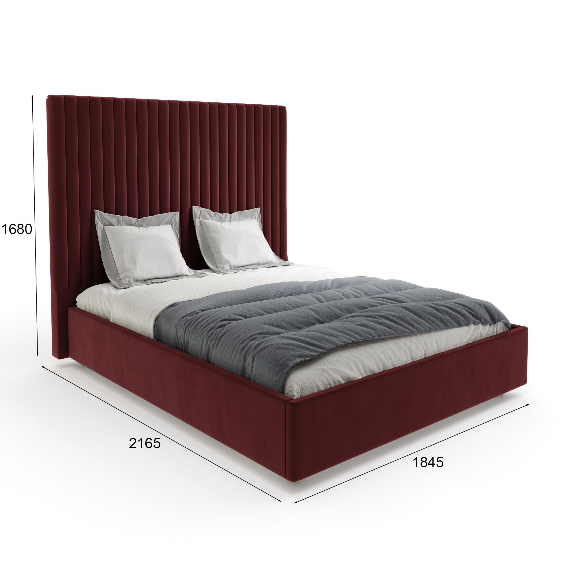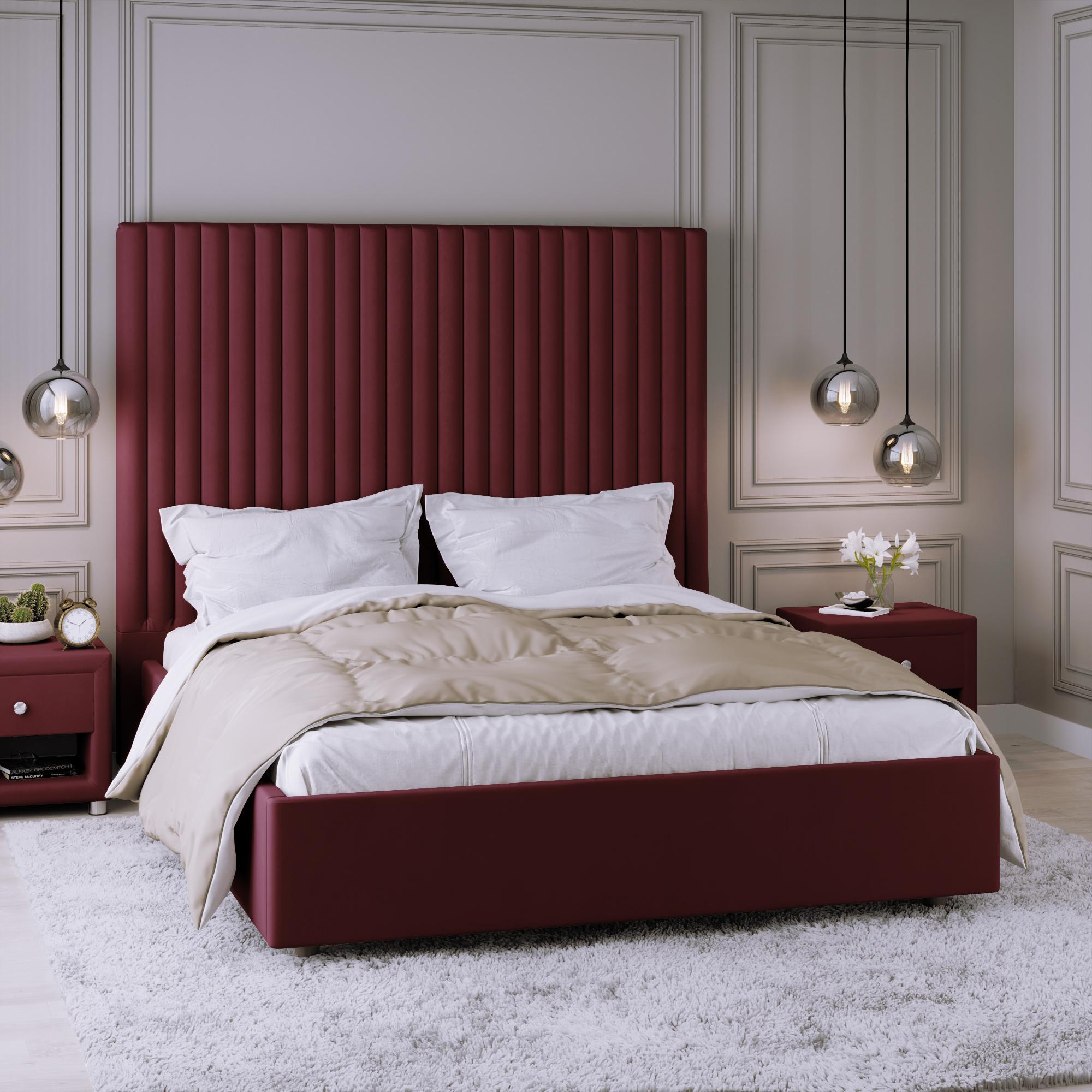 Высокое изголовье с объёмным декором — главная изюминка дизайна.