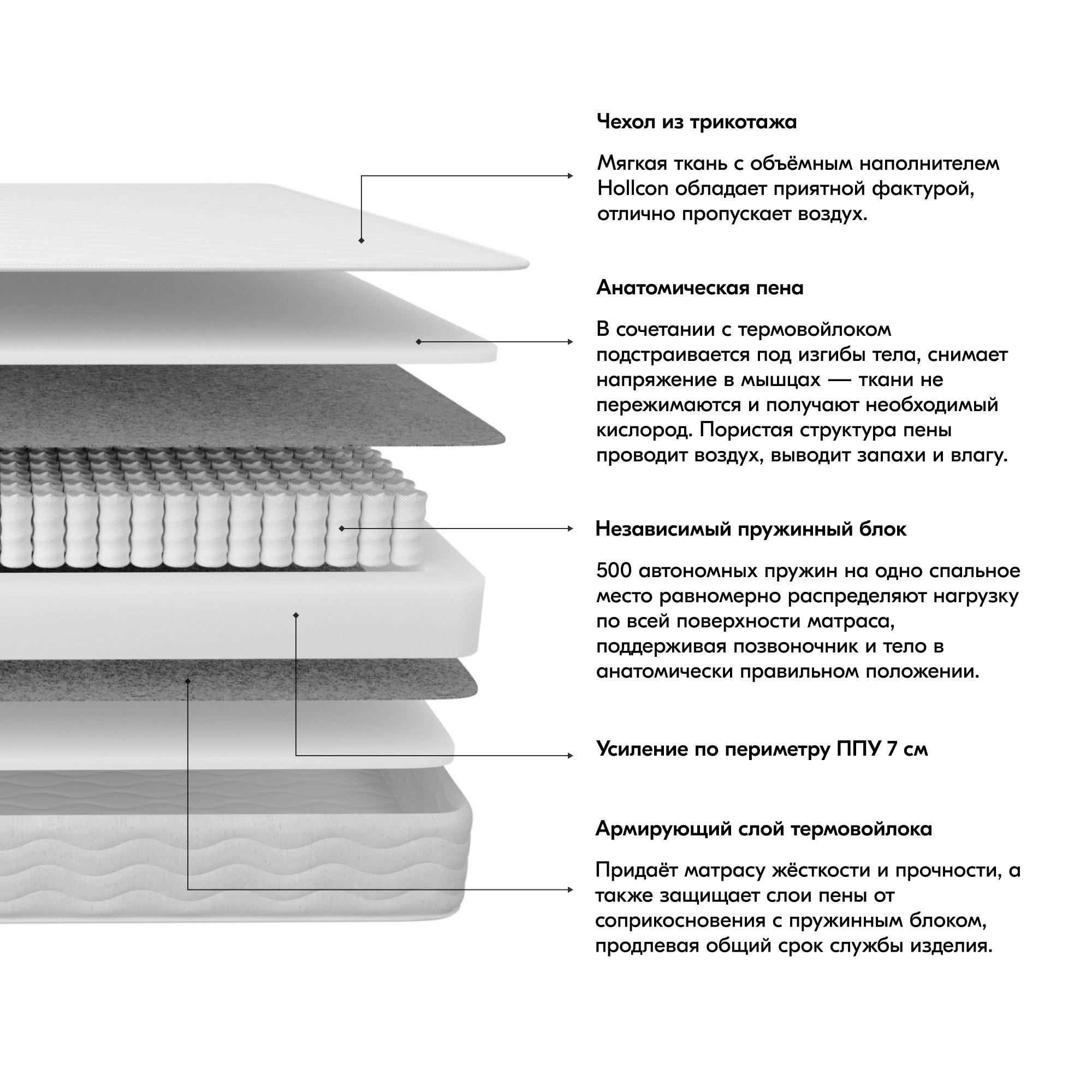 Независимый пружинный блок. Основа матраса высотой 14 см состоит из 500 пружин на спальное место. Каждая пружина производится из высокоуглеродистой стали на европейском оборудовании.
