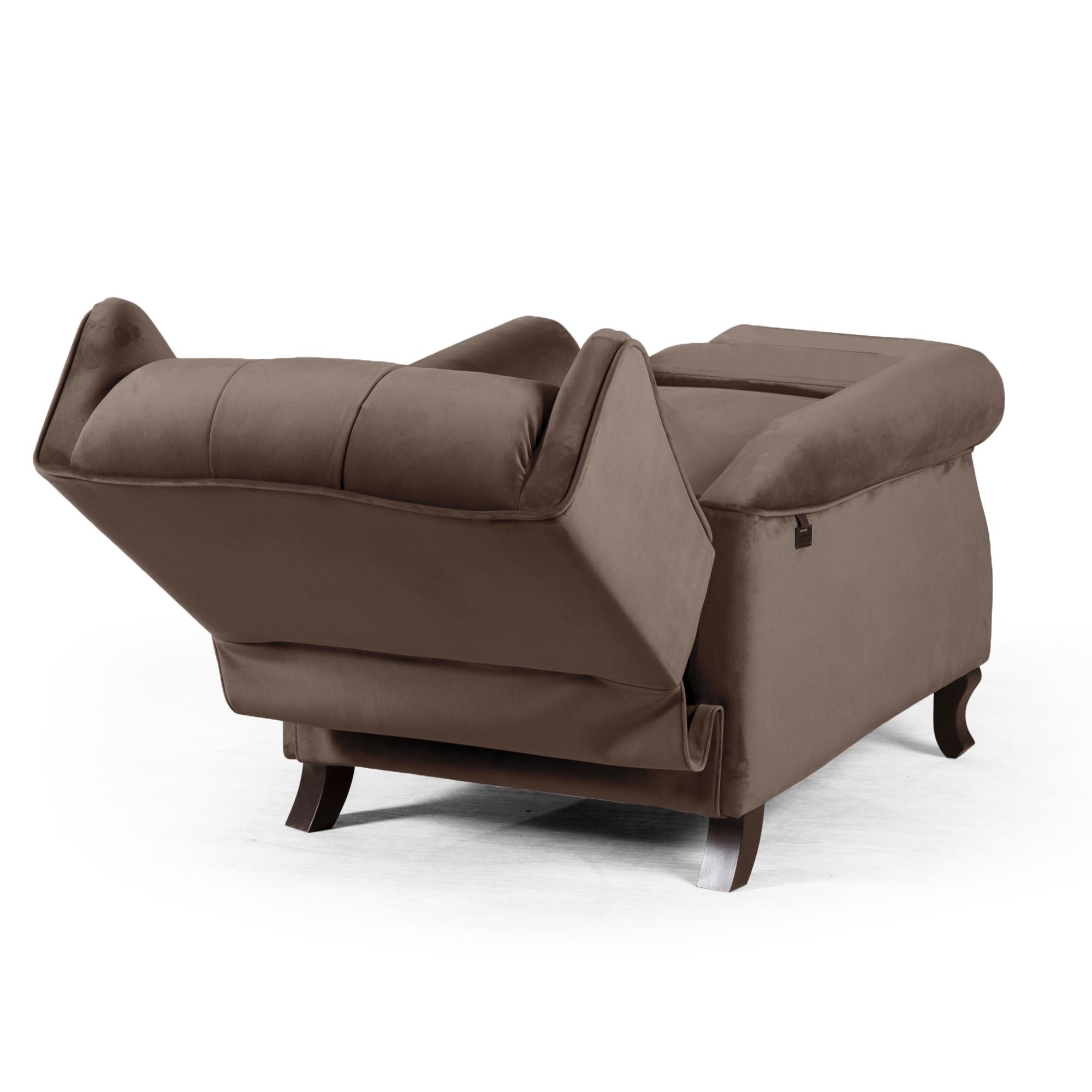 Скрытый механизм трансформации «облегчённый реклайнер». Кресло автоматически опускает спинку и поднимает изножье - достаточно откинуться на спинке. Угол наклона зависит от силы давления на спинку. Для приведения кресла в первоначальное положение приподнимитесь в кресле и надавите ногами на изножье.