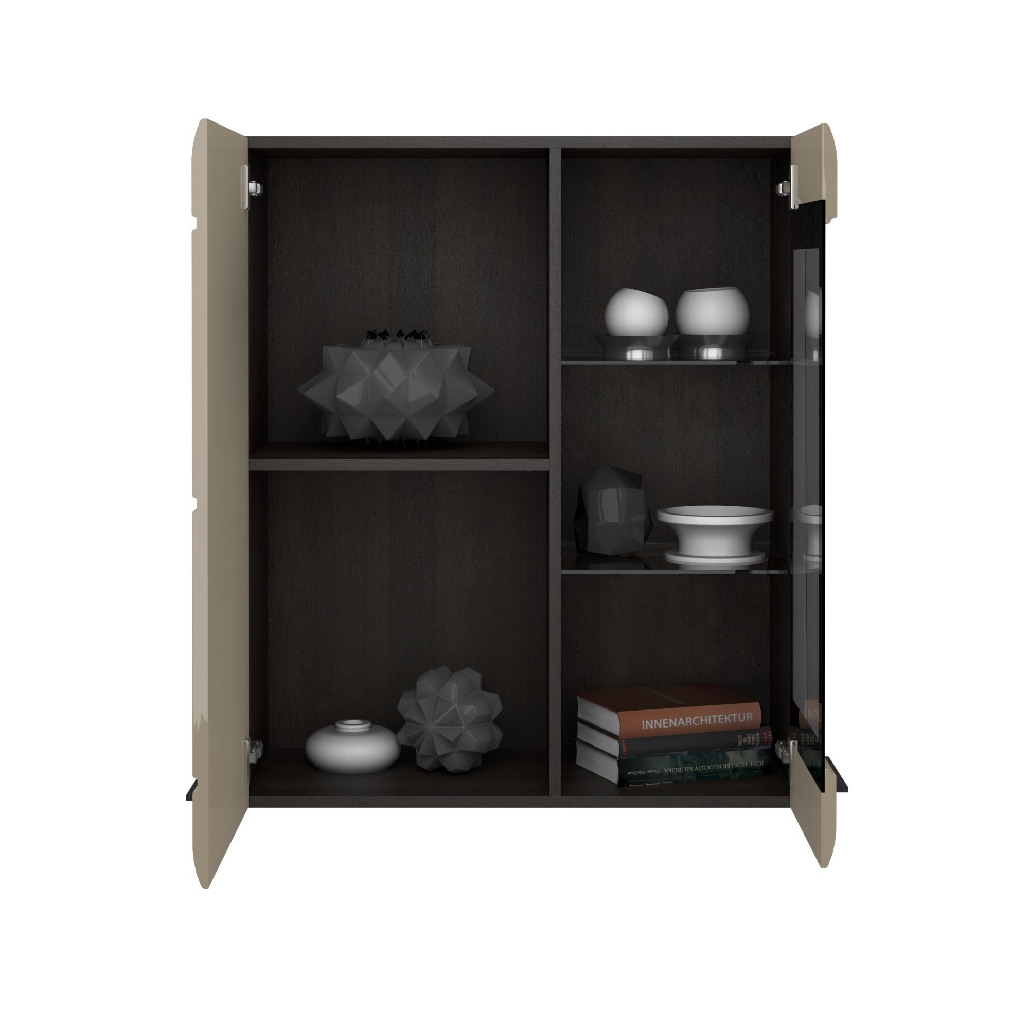 - Витринное отделение с двумя полками из стекла. Сквозь рамочный фасад можно разглядеть содержимое стеклянных полок: сервиз, вазы, фоторамки и прочие предметы декора.