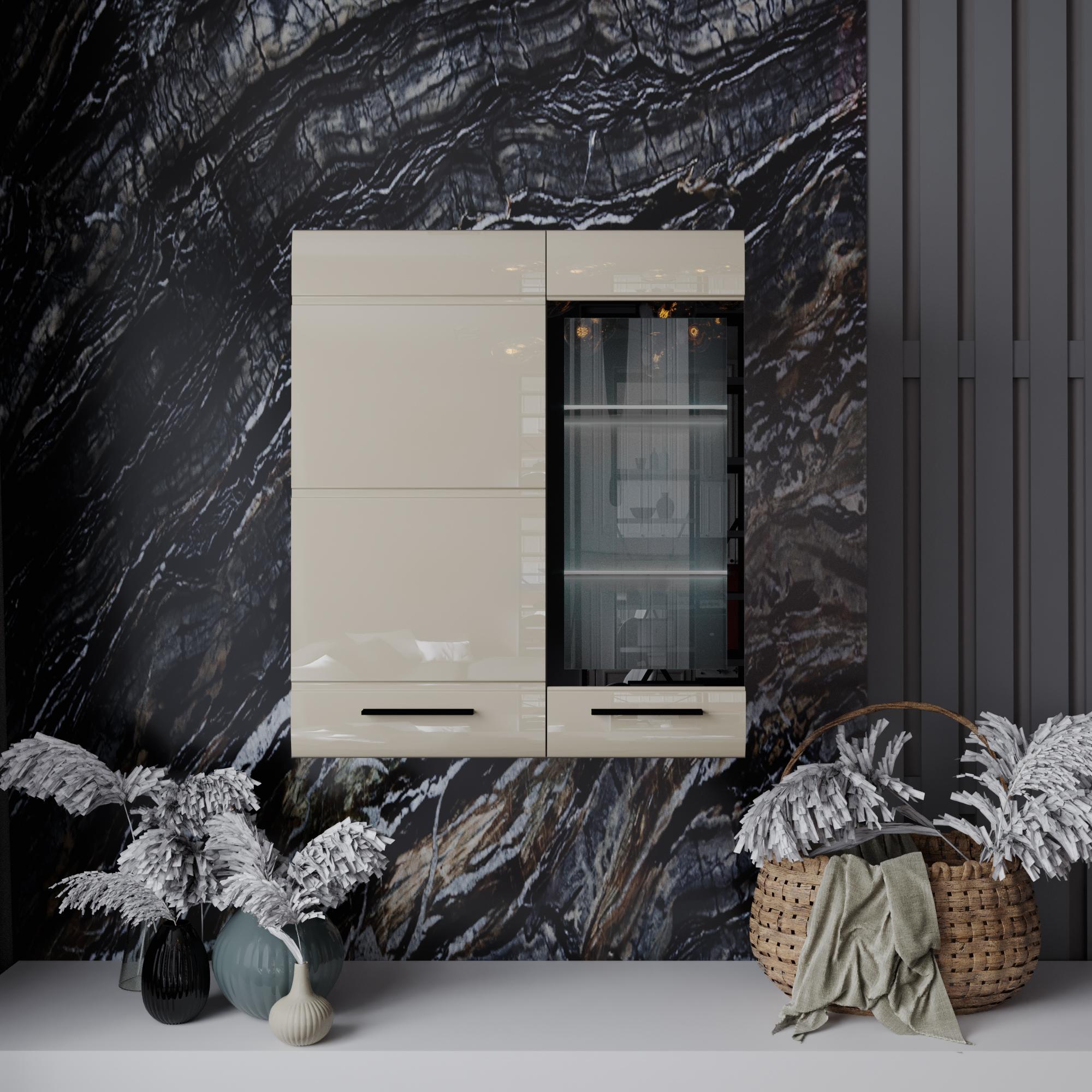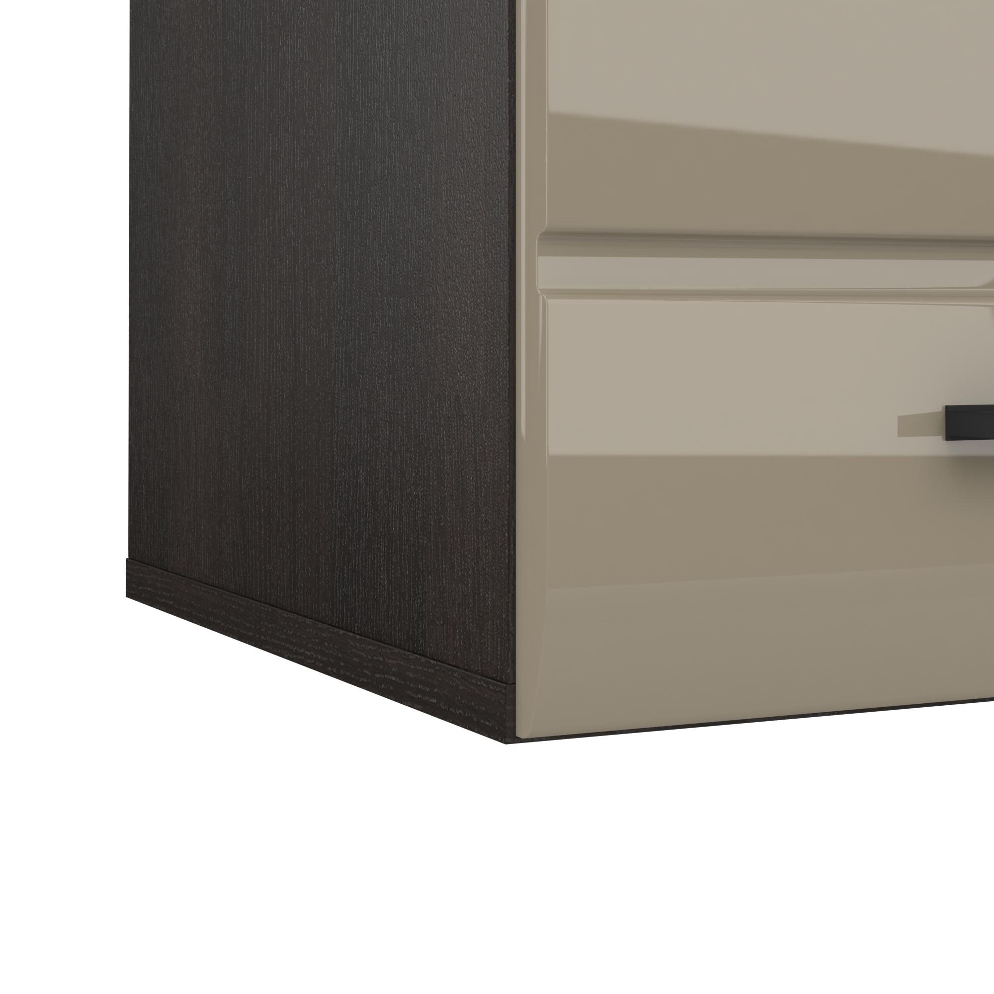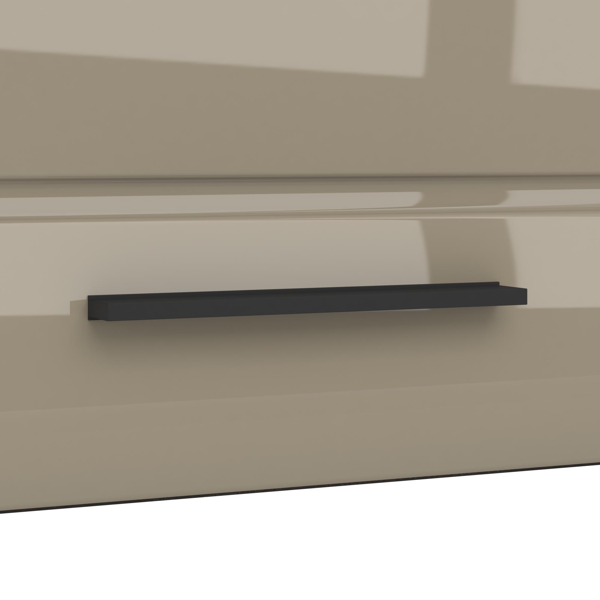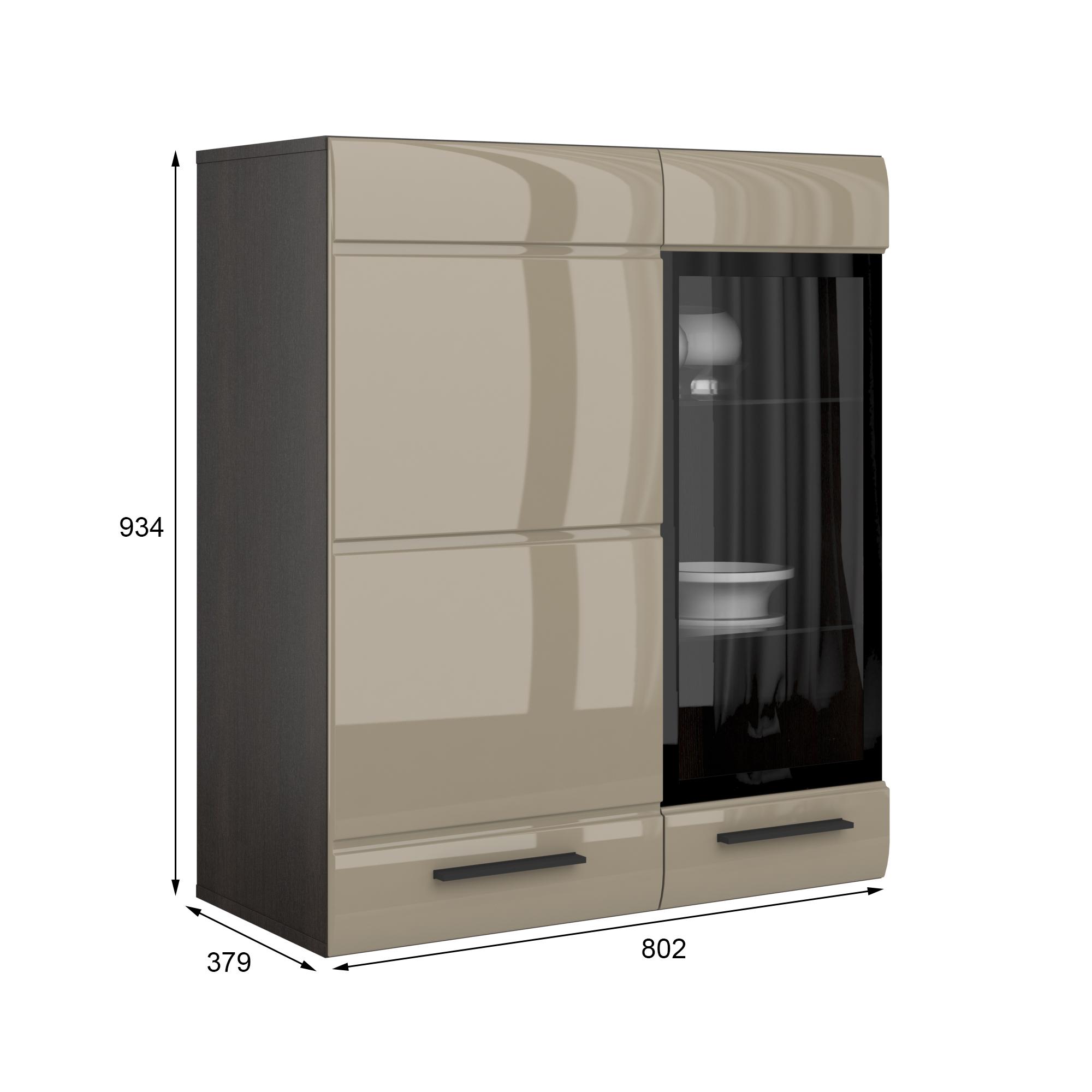 - Глянцевые фасады. Фасад закрытого отделения покрыт лаком с эффектом «высокий глянец». Фасад витрины изготовлен из закалённого стекла с чёрной рамкой по периметру, верхняя и нижняя панели также покрыты лаком.