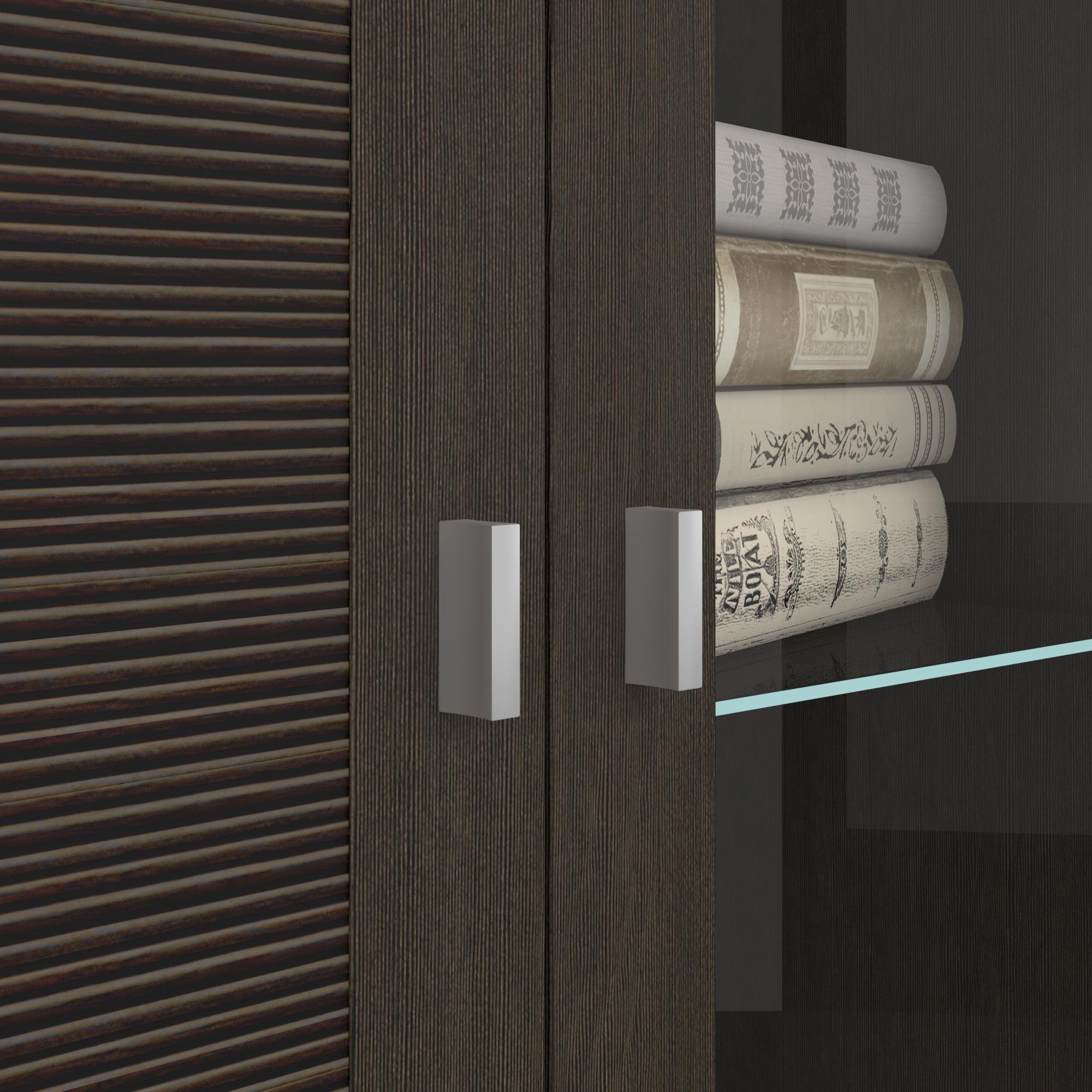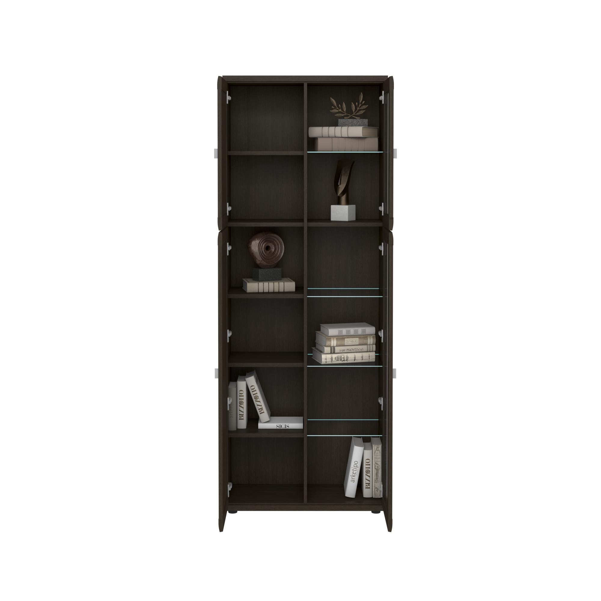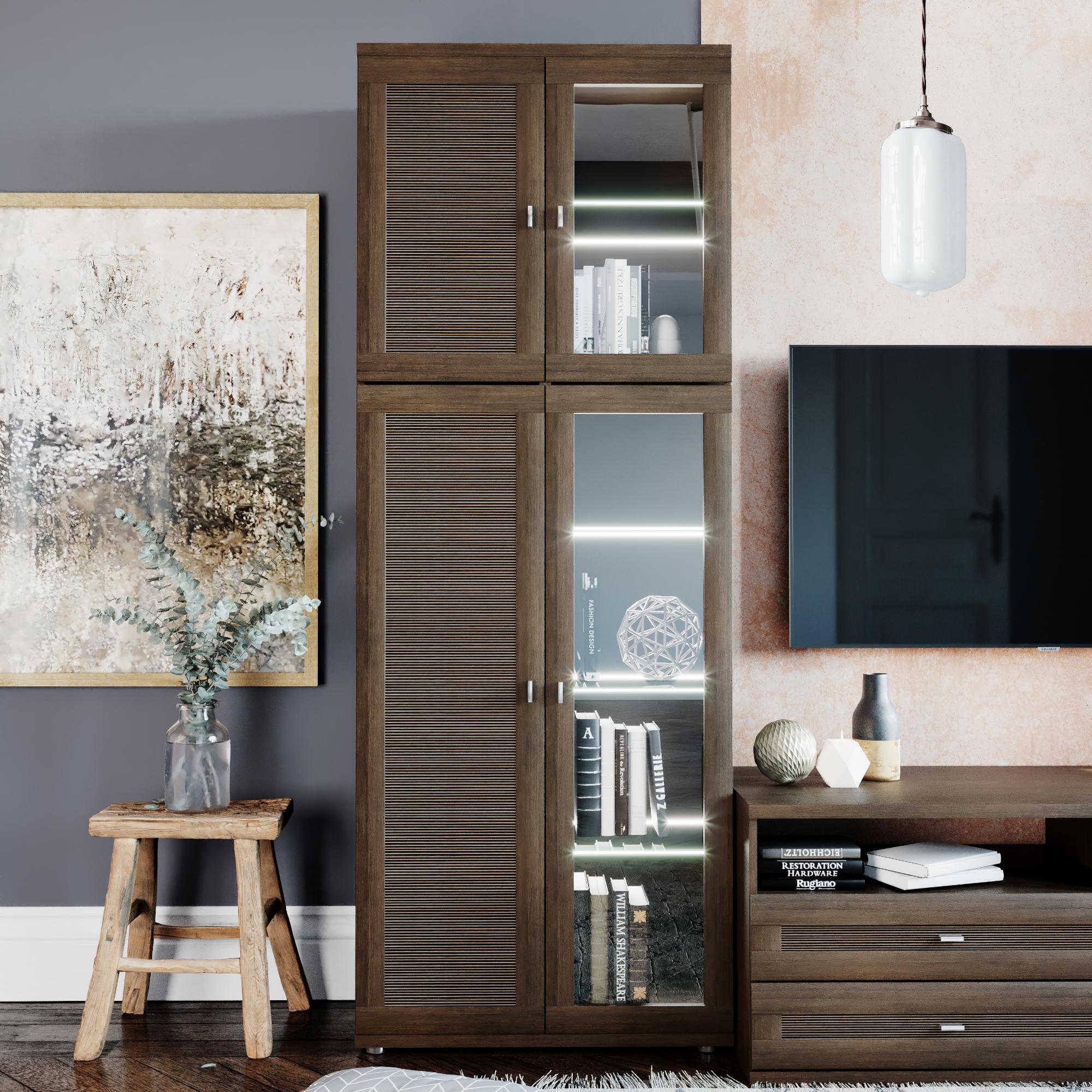 - Витрина с подсветкой стеклянных полок. Одна половина шкафа разделена на два отделения со стеклянными полками, на которых можно расставить книги, посуду, предметы коллекции. Диодные светильники на полках мягко подсветят вещи.