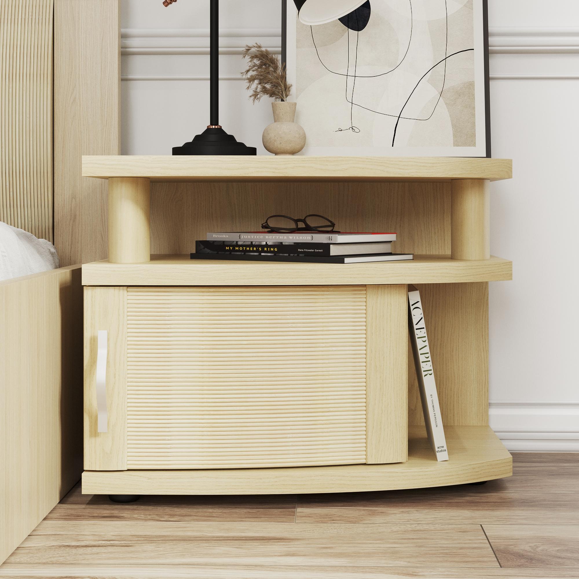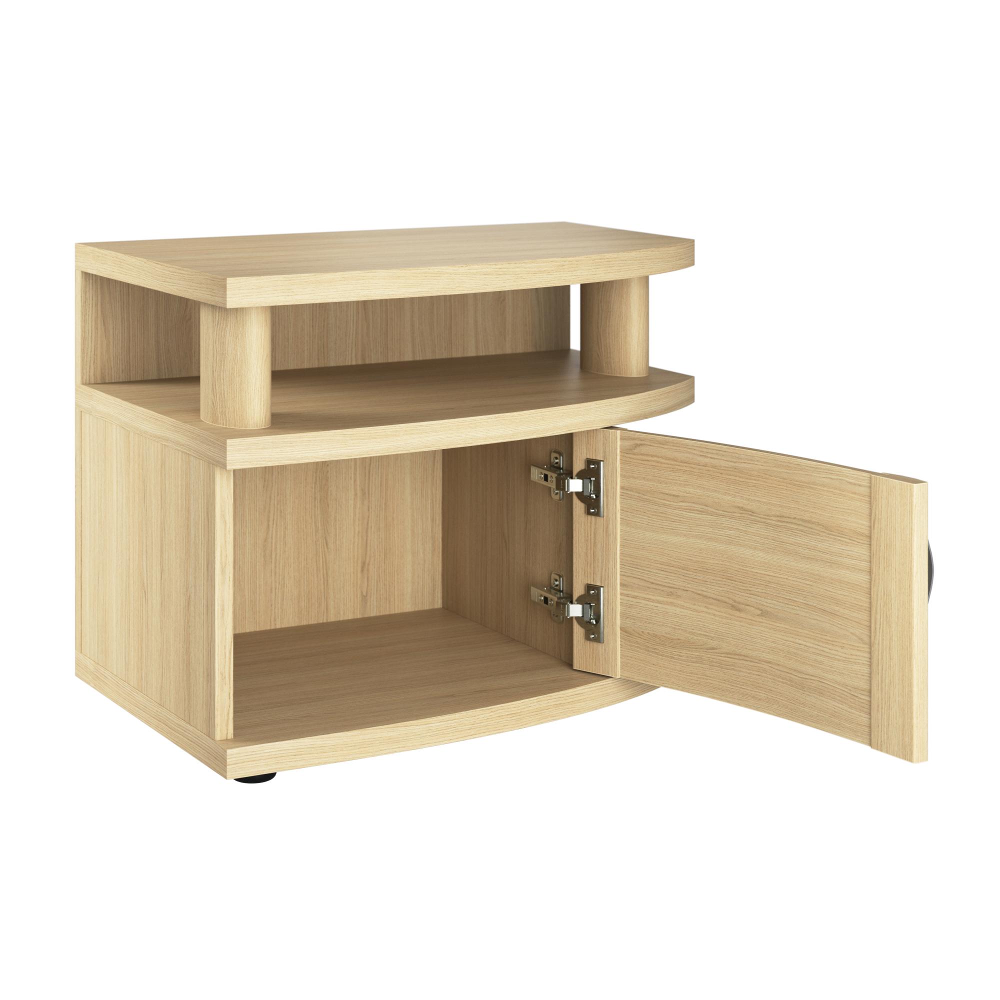 - Открытые полки и шкафчик. Удобное хранение личных вещей в шкафу, повседневных аксессуаров на широкой полке и любимых книг на маленькой полочке с внешней стороны тумбы.